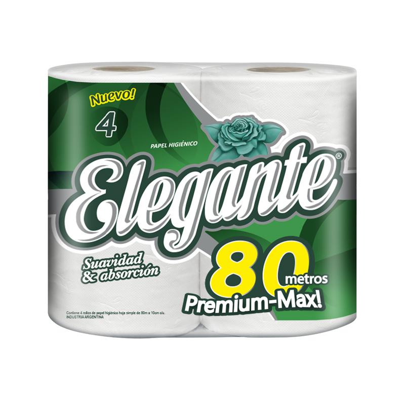 Papel higiénico blanco simple hoja por 80 metros cada rollo. Pack 4 rollos.